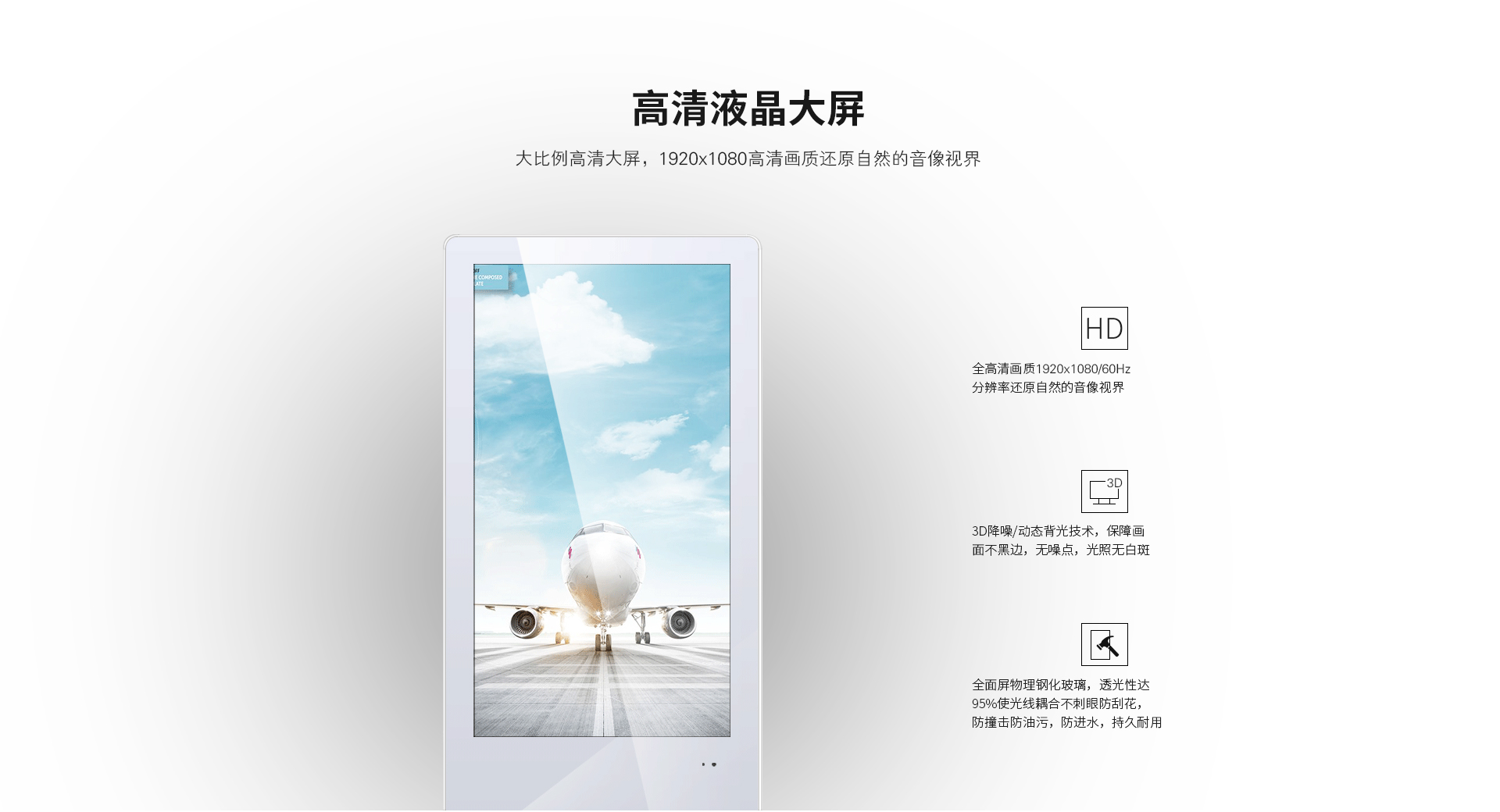 型號:ZYST-IN18.5WF 分辨率:1920*1080 亮度:450cd/㎡ 18.5寸電梯廣告機主要用于安裝在電梯轎廂內(nèi)部,平時播放電梯乘梯安全宣教信息、公益宣傳信息、各類通知、廣告等;緊急狀態(tài)下(如電梯運行異常時)實現(xiàn)應急告警,及時聯(lián)系救援人員;利用網(wǎng)絡連接(支持有線、WIFI、3G、4G等連接方式)實現(xiàn)設備和節(jié)目的統(tǒng)一管理和發(fā)布,并借助終端的傳感數(shù)據(jù)采集電梯相關運行數(shù)據(jù),通過微處理器進行非常態(tài)數(shù)據(jù)分析,由服務器進行綜合處理,從而實現(xiàn)電梯故障報警、困人救援、日常管理、質量評估、隱患防范等功能。