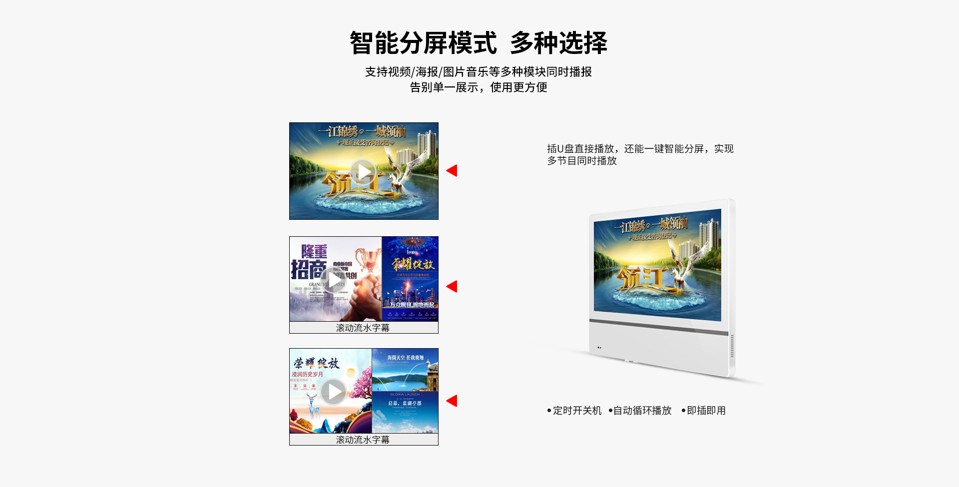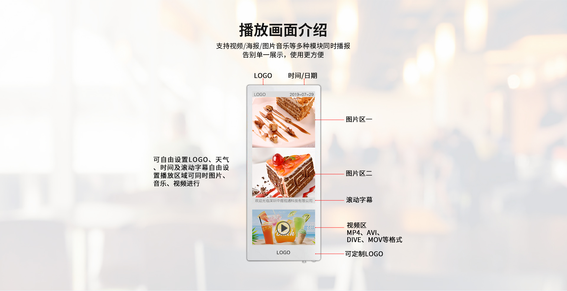 18.5寸電梯廣告機可以實現(xiàn)數(shù)字化多媒體播放,可以播放音頻、視頻、圖片、文檔等一系列媒體文件。支持主流的(MP3,APE,F(xiàn)LAC,AAC,OGG)等音頻格式。同時支持多種格式(MKV,MPEG4,AVI,F(xiàn)LV,MOV,RMVB,WMA)視頻播放,還支持各種圖片文檔類(JPEG, BMP, PNG,GIF )的廣告播放功能。