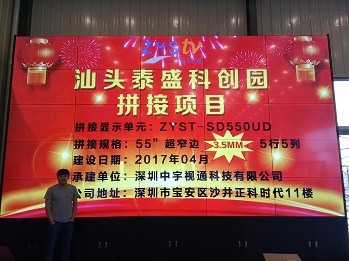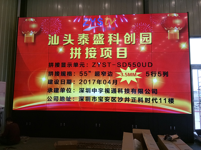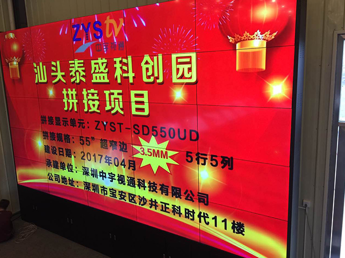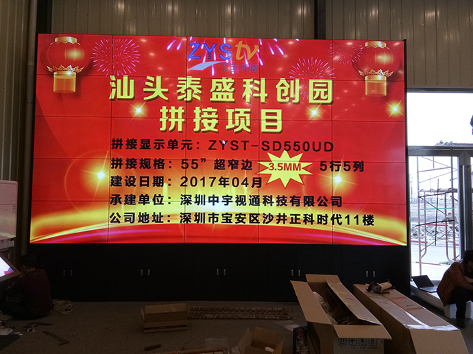 此次泰盛科技為了更好的展示公司以及園區(qū)信息,進(jìn)過考察與深圳中宇視通科技有限公司攜手合作成功打造了一個5行5列55寸3.5mm拼縫拼接大屏。