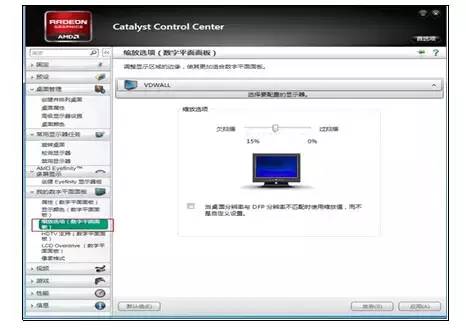 右鍵點擊桌面空白位置,在彈出菜單中選擇“ATI控制面板”,然后在ATI控制面板中選擇“我的數(shù)字平面面板”→“縮放選項(數(shù)字平面面板)”,將其設(shè)置為“過掃描0%”,則DVI信號被設(shè)置為滿屏輸出。